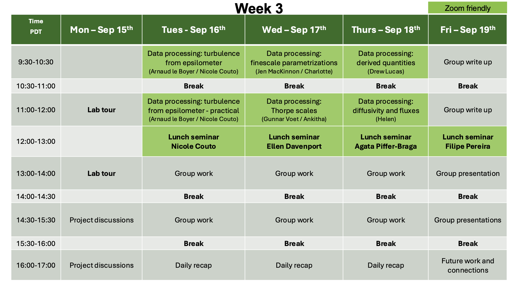 In the spirit of knowledge sharing and making things accessible, we will make most of the lectures in this course available to anyone and stream them live on Zoom. Please note however that the course was designed to be in person and thus some lectures will involve boardwork and group discussions that might not translate well to the remote format. The schedule below show the topics covered and lectures held in week 1 and 3 of the course (the second week of the course is fieldwork only). Times are in Pacific Daylight Time (UTC/GMT-7). Any schedule item marked in green will be live-streamed at the following Zoom link (with password) found below.